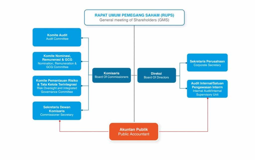 The corporate governance structure at the Company adopts the system regulated by Law No. 40 of 2007 on Limited Liability Companies. The main organs consist of the General Meeting of Shareholders (GMS), the Board of Commissioners, and the Board of Directors. The management of the Company follows a two boards system, with the Board of Commissioners and the Board of Directors, each having authorities and responsibilities as outlined in the Articles of Association and applicable laws.