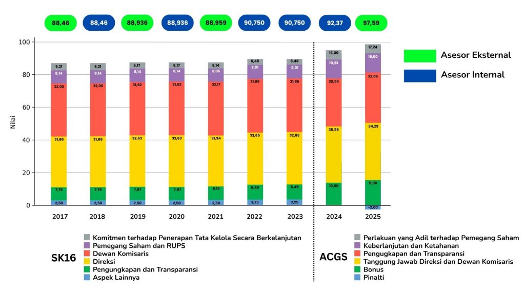 Asesmen GCG menggunakan acuan Keputusan Sekretaris Kementerian BUMN Nomor SK-16/S.MBU/2012 tentang Indikator/Parameter Penilaian dan Assessment atas Penerapan Tata Kelola Perusahaan yang Baik (Good Corporate Governance) pada BUMN dan dalam pelaksanaannya bekerja sama dan didukung oleh seluruh Insan Perusahaan. Penerapan GCG di Perseroan semakin masif, di mana skor GCG mengalami peningkatan yang cukup signifikan tiap tahunnya dengan detail sebagai berikut :